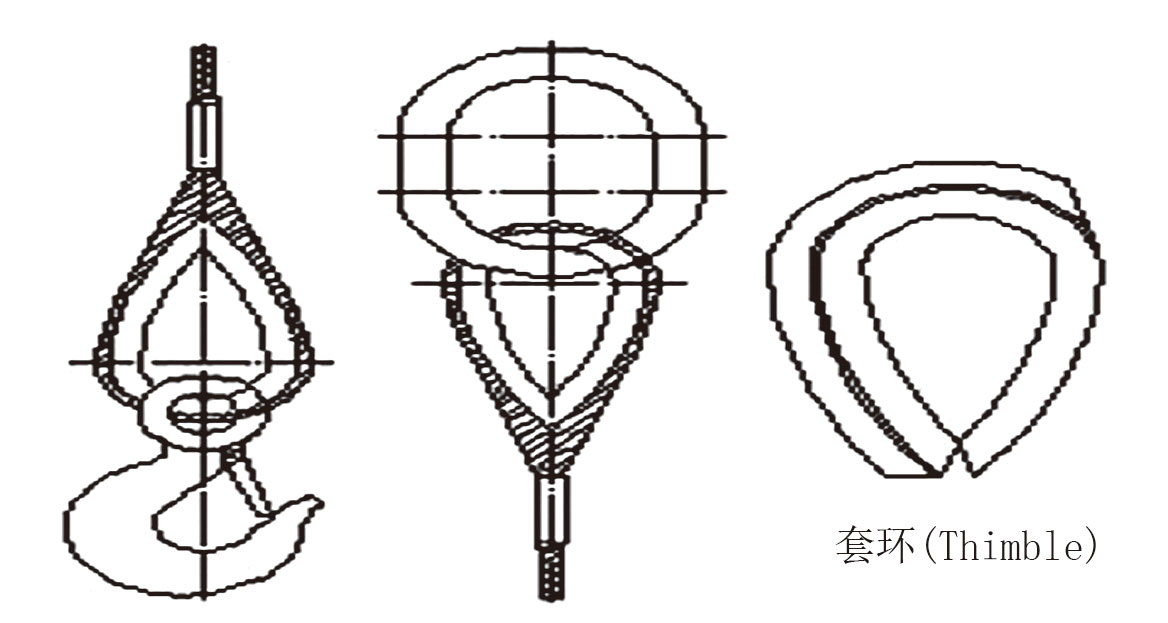 1、成套钢丝绳索具与吊环、吊钩、卸扣等连接处,是最容易受伤的地方,可加套环进行保护,延长索具使用寿命。(以压制钢丝绳索具为例,插编钢丝绳索具同理)