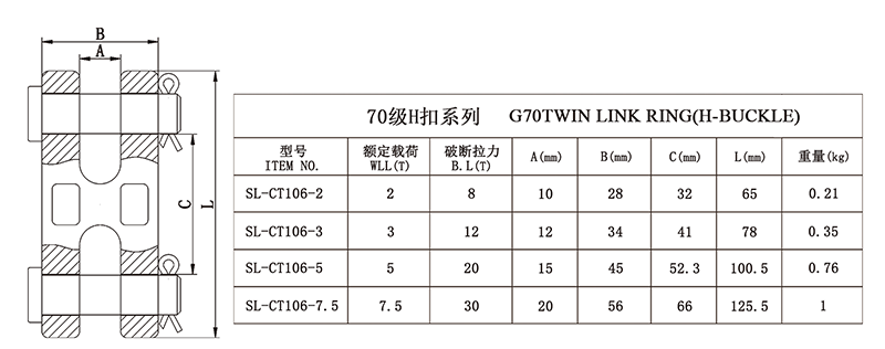 1、特点:合金钢模锻。 2、抽样进行破断测试。 3、100%磁粉探伤。 4、70级仅用于捆绑与拖拉,绝不能用于起重。