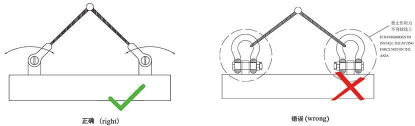 8.卸扣要正确的支撑着载荷,即作用力要沿着卸扣的中心线的轴线上,避免弯曲,不稳定的载荷,更不可以过载(如下图)。